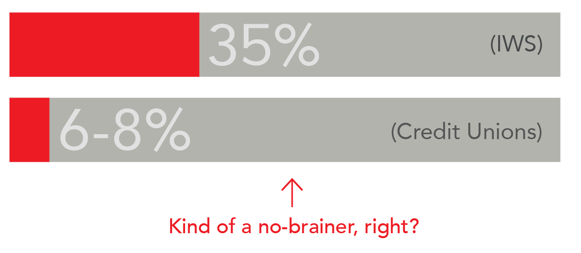 Work less, earn more. When members are referred to our Product Information Center, IWS converts 35% of those leads to VSAs/MBIs. In contrast, we’ve found that credit unions on average sell a VSA/MBI to 6-8% of members.